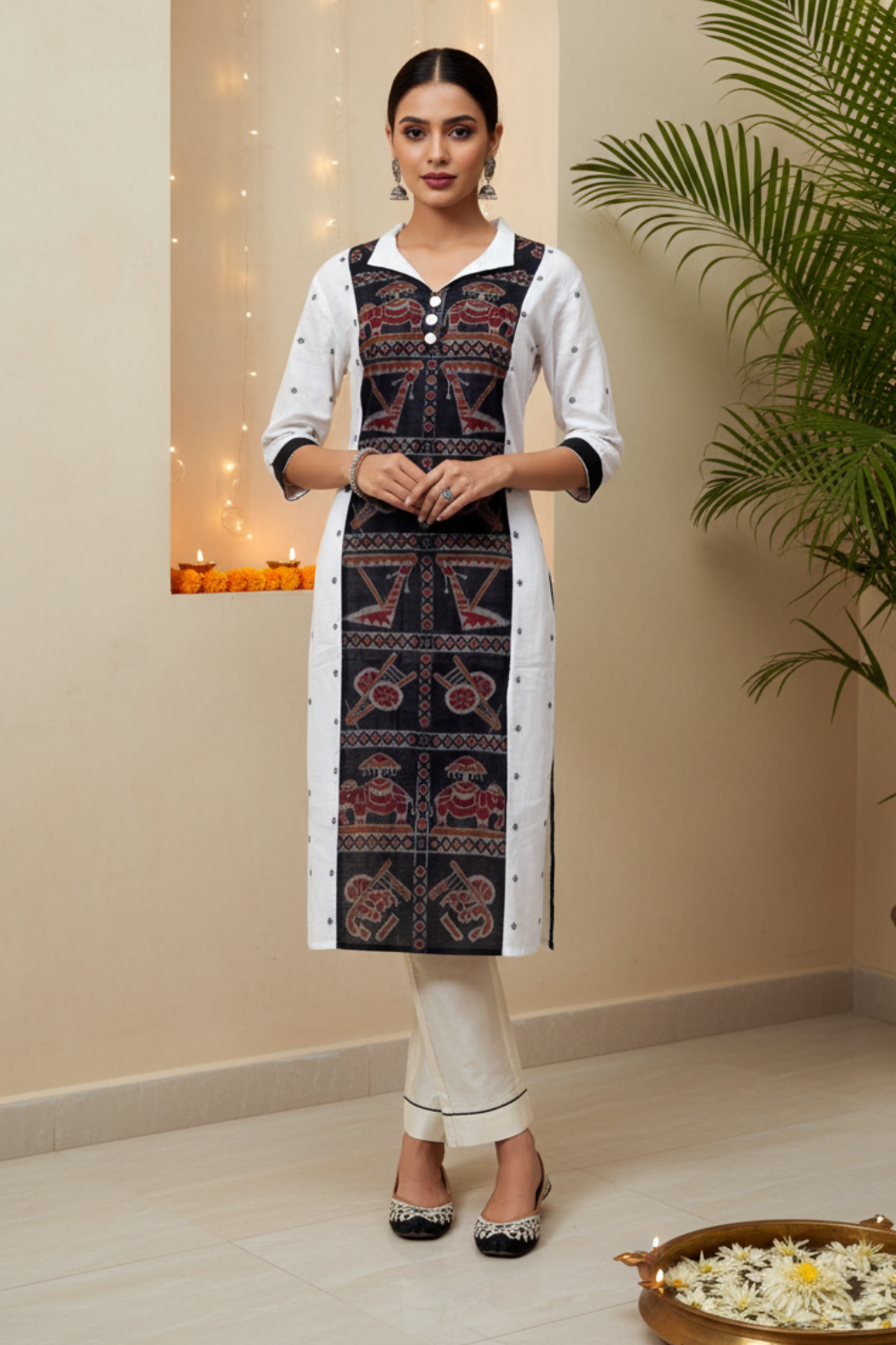 Handwoven by Kuntala Aunty in Odisha using time-honored looms, the fabric takes 10-12 days to complete before our skilled tailor Avilash Bhai adds fine detailing and fit. The cream body with minimal tribal dots beautifully contrasts the storytelling panel, making it a perfect pick for festivals, traditional functions, and elegant daywear.
