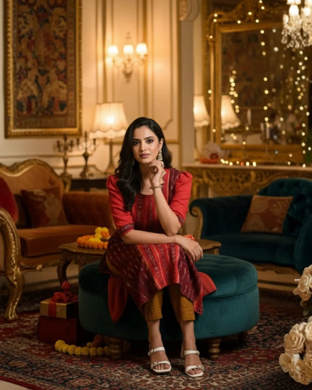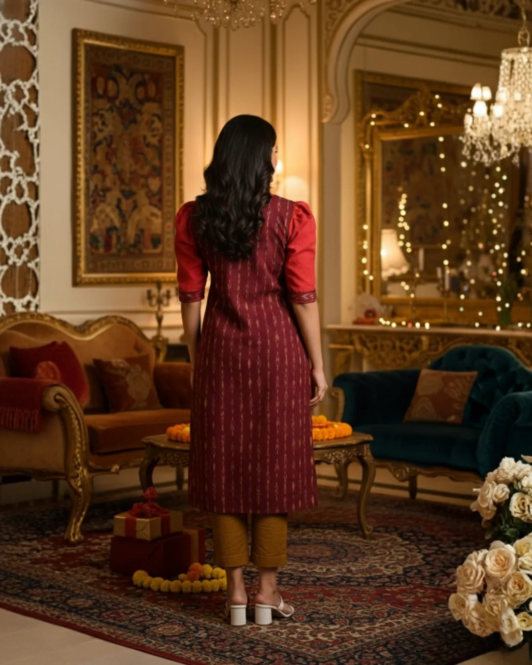 Inspired by the opulence of Indian heritage, Mahika is a vision of timeless charm and festive splendor. Crafted from authentic Sambalpuri handwoven cotton, this kurti brings together deep maroon and scarlet hues, colors that symbolize strength, passion, and grace.