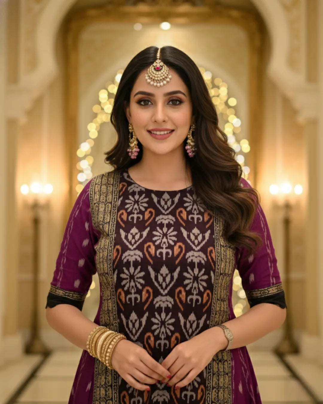A symphony of heritage and grandeur, Shanaya radiates the magnificence of Indian handlooms. Drenched in rich plum purple, this flared Sambalpuri cotton gown captures the essence of royal elegance. The center panel showcases intricate black ikat motifs framed in antique gold zari, a pattern reminiscent of temple architecture and age-old artistry.